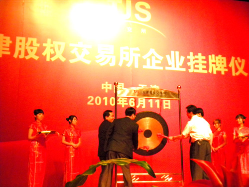 2010年6月11日上午9點29分,一個讓天成人永遠(yuǎn)銘記的時刻,隨著四柄紅槌一起敲響天交所的開市銅鑼,河北天成藥業(yè)股份有限公司股權(quán)在天津股權(quán)交易所鳴鑼開市,當(dāng)日成交338000股,成交金額118.3萬元。